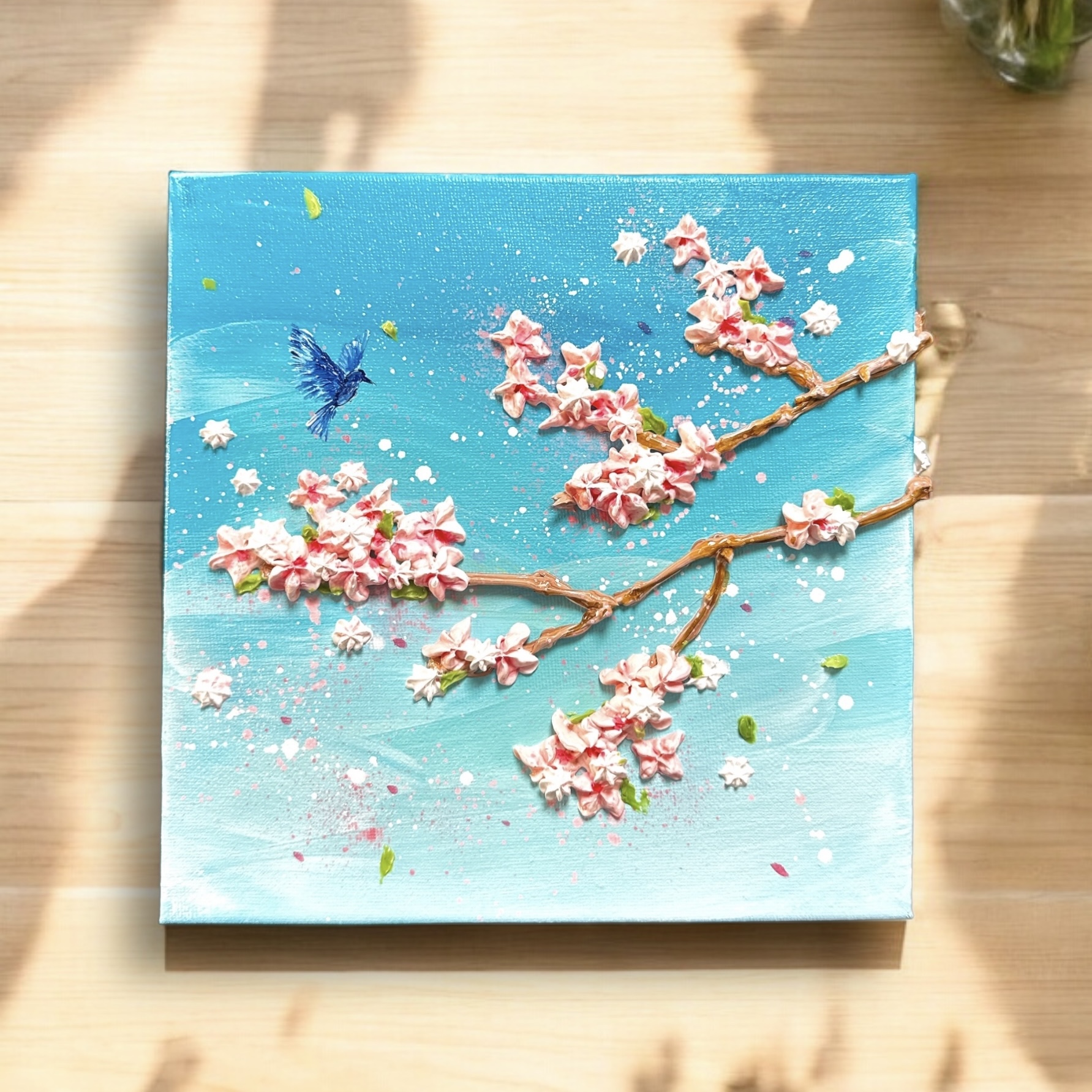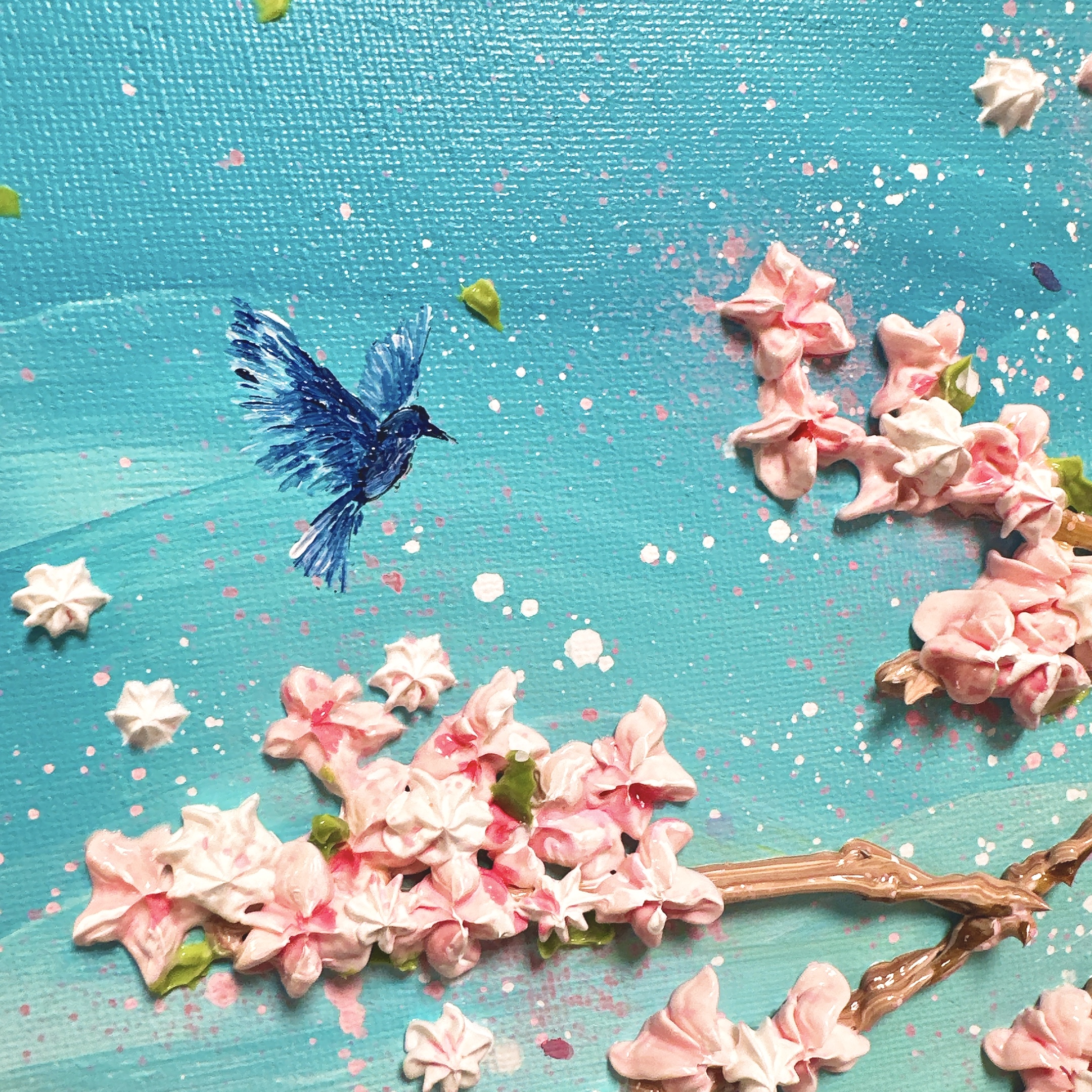 桜をイメージした木の枝にとまって羽休めをしながら「次はどこへ行こう」と考えるかもしれません。