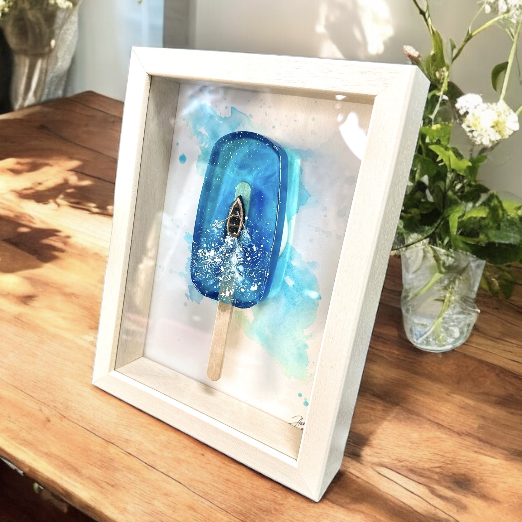 (額つきなので壁にかけても、立てかけても飾っていただける作品です。アイスバーと額の板は接着しています)