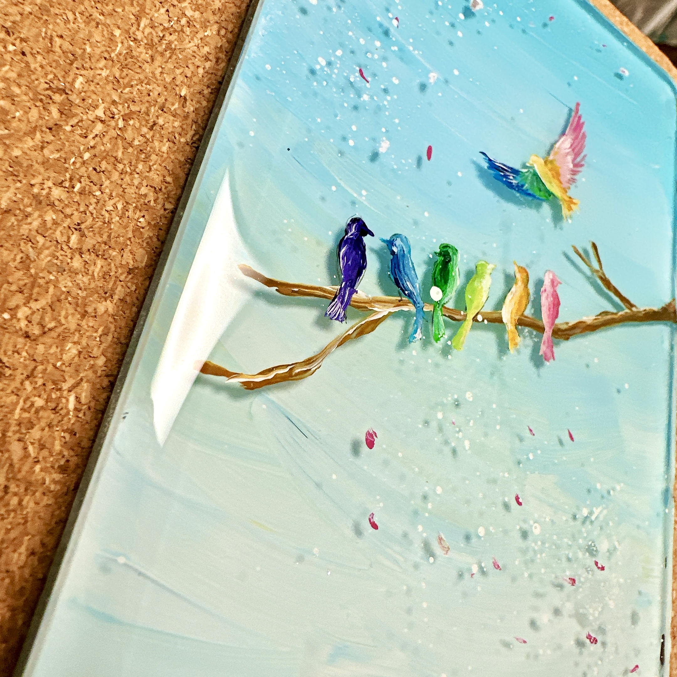 今回は虹色の個性を持つ鳥たちをレジンとアクリルで表現しました。