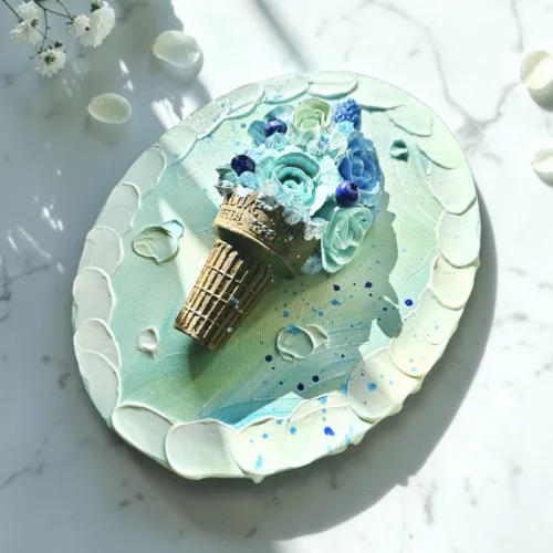 (グラスはメディウムで固定しているので立てても落ちません。この作品は「はるアトリエモリモリジェルメディウム」を使用して製作しています。)