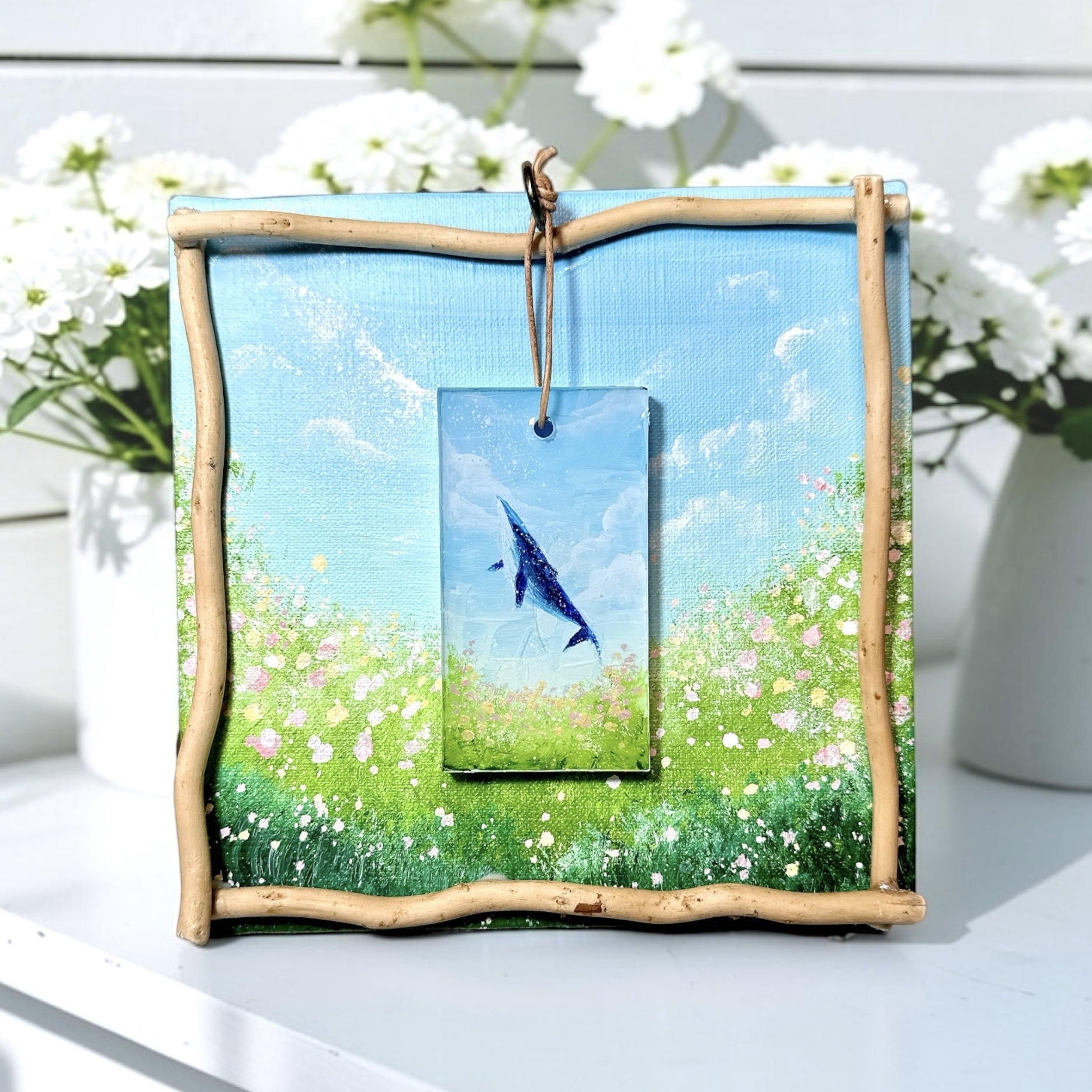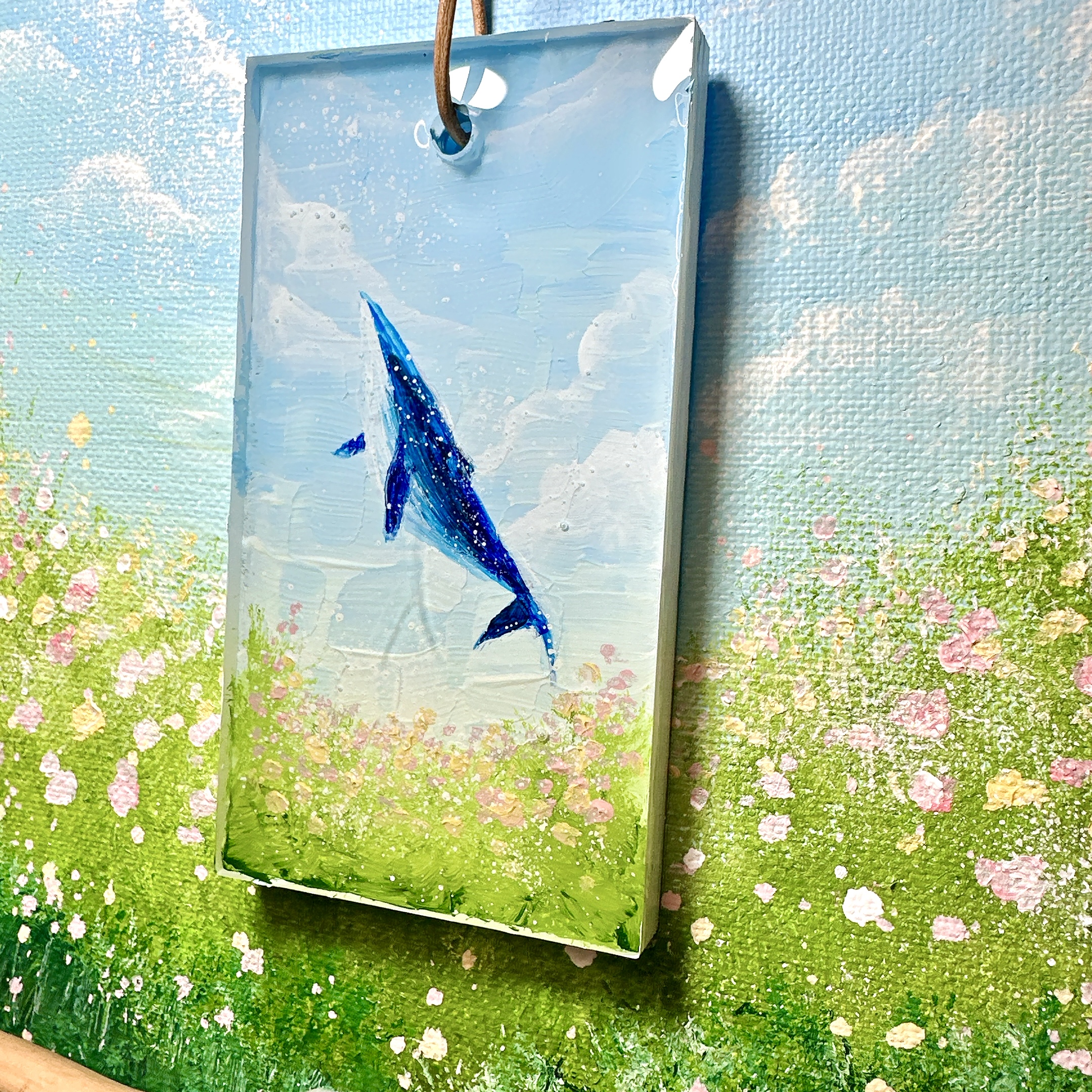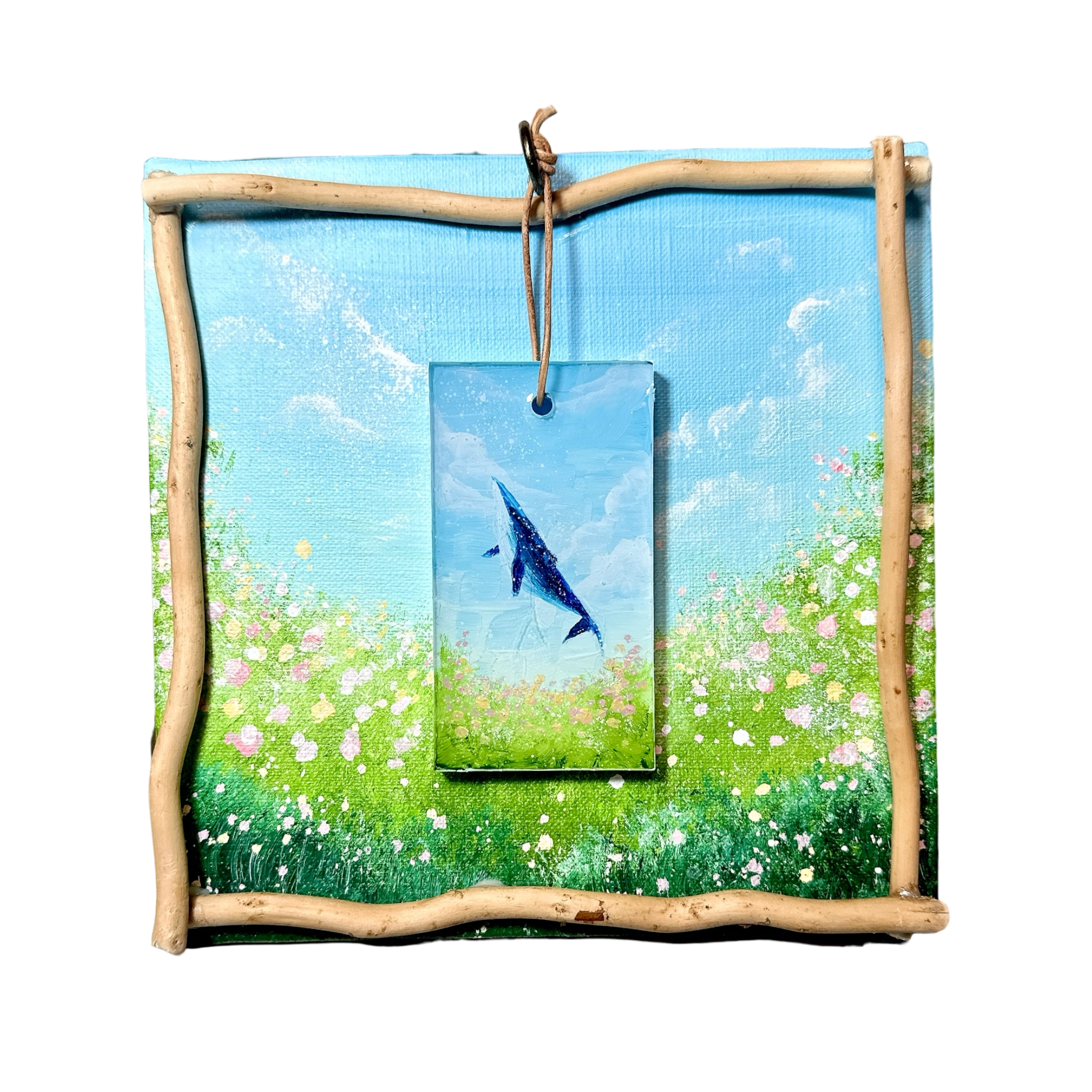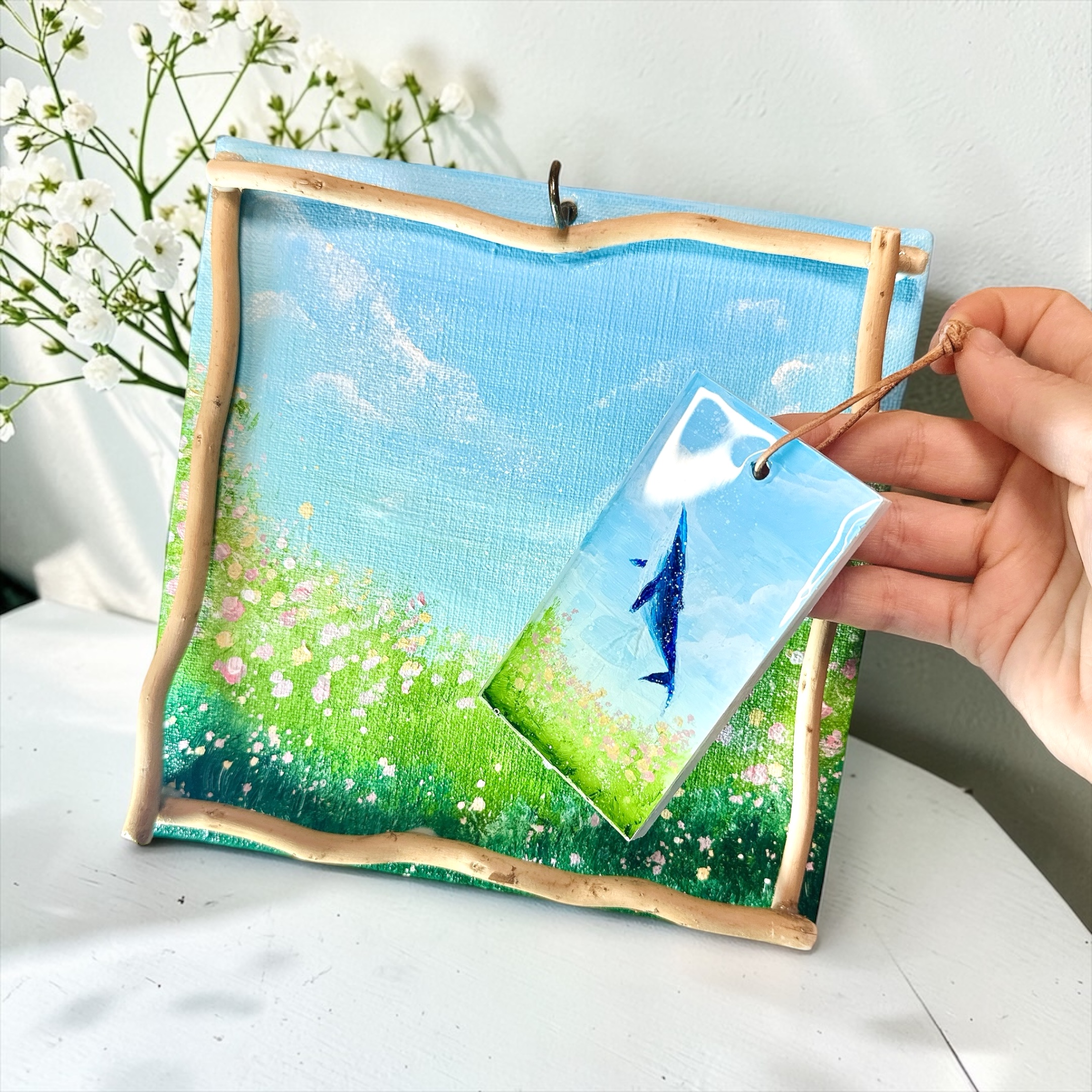 また中央で揺れるクジラはキーホルダーになっており、フックから外すことが可能ですので1枚のアートで2面お楽しみいただけます。