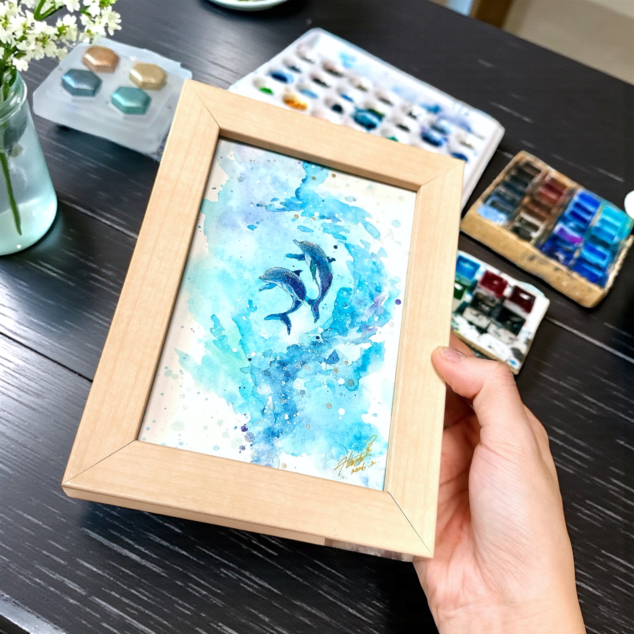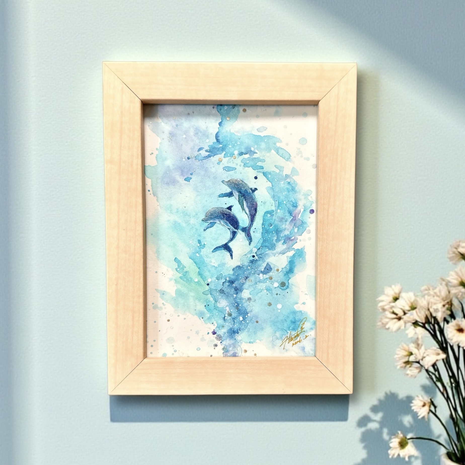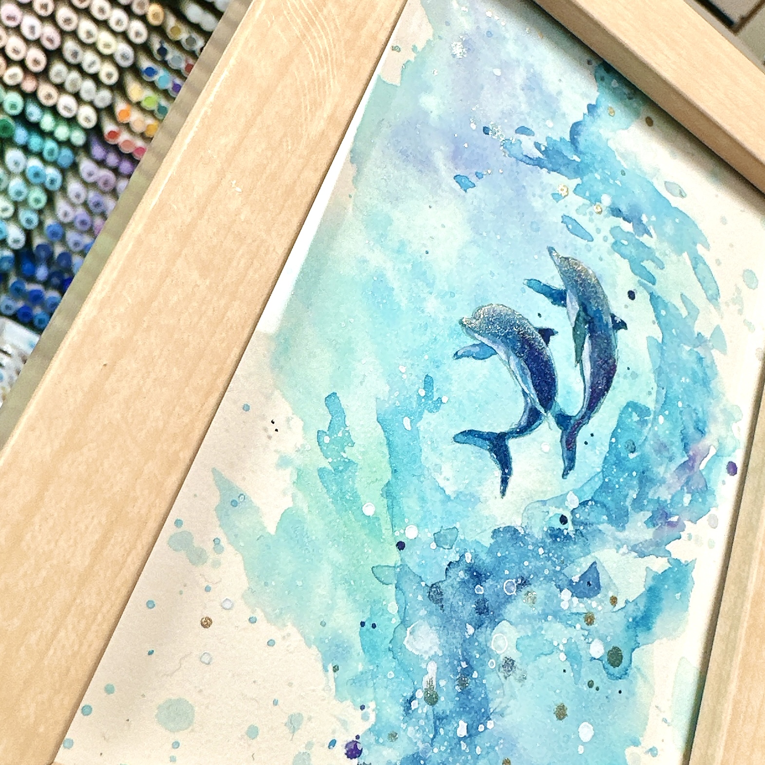 今回は、透明感あふれる水彩の海で、息を合わせて寄り添い泳ぐ2頭のイルカを表現しました。