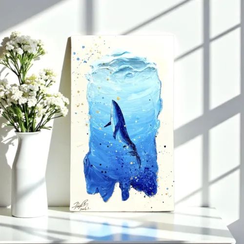 背景には高発色のゴールド絵の具を散りばめているので光の当たり方が変わると輝いてくれます。