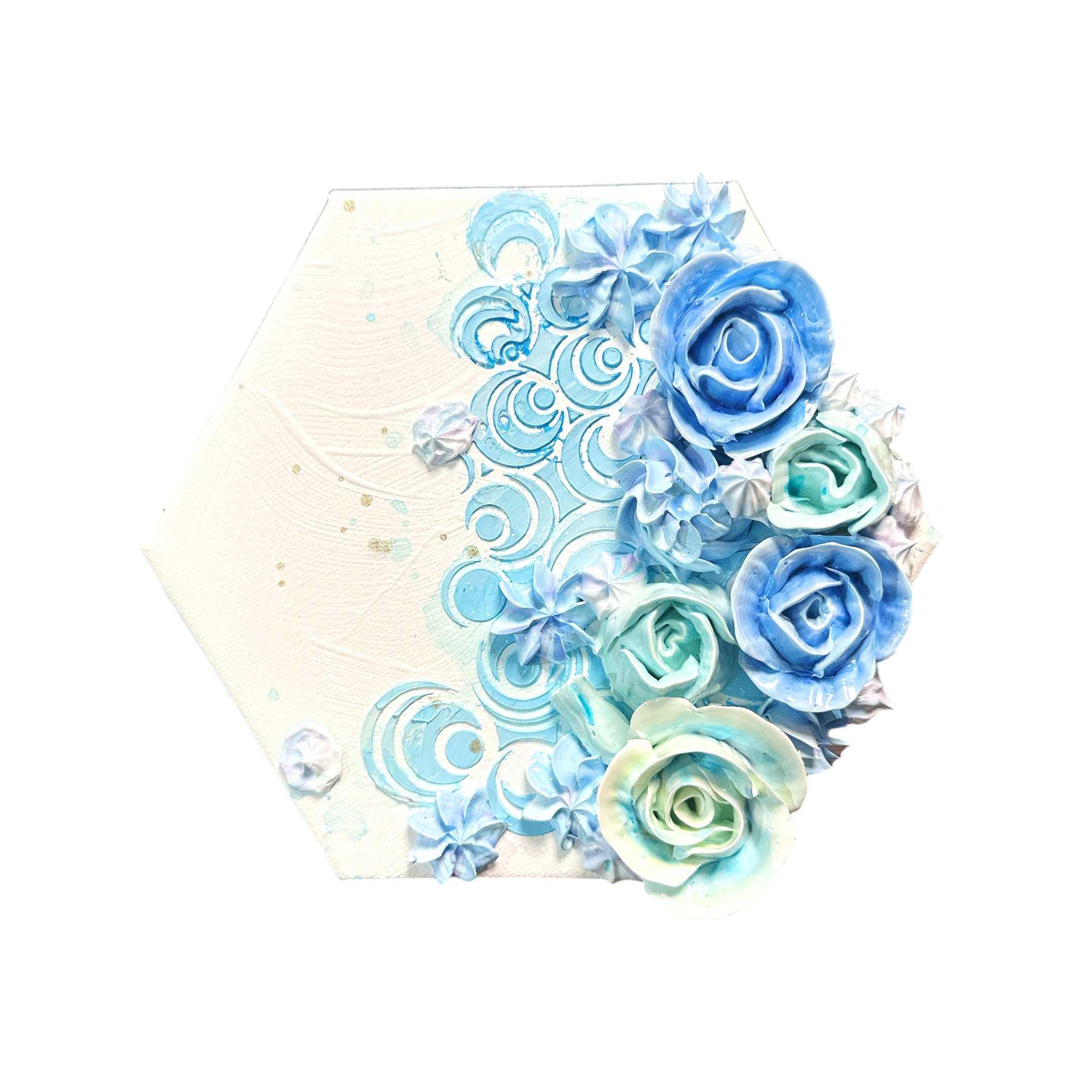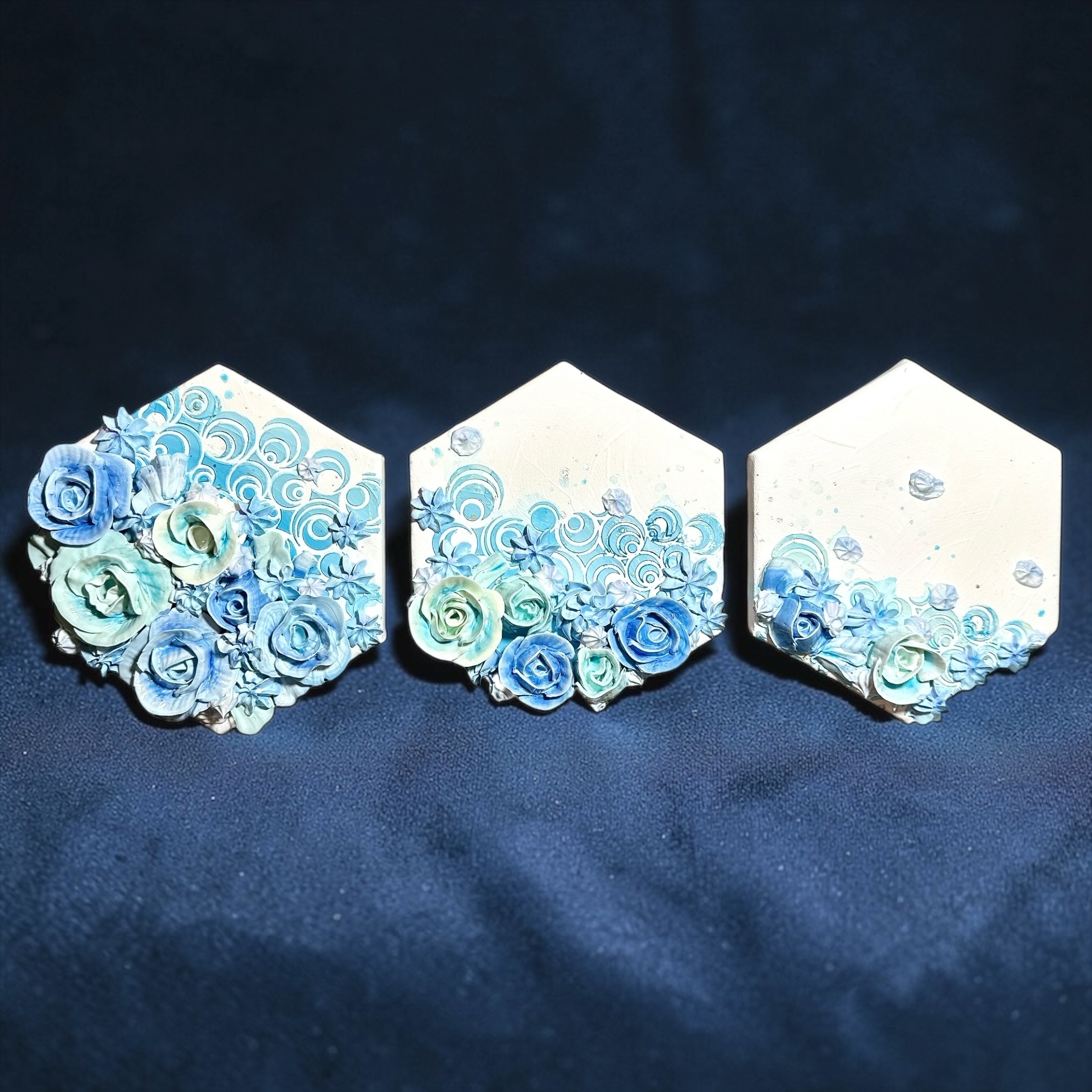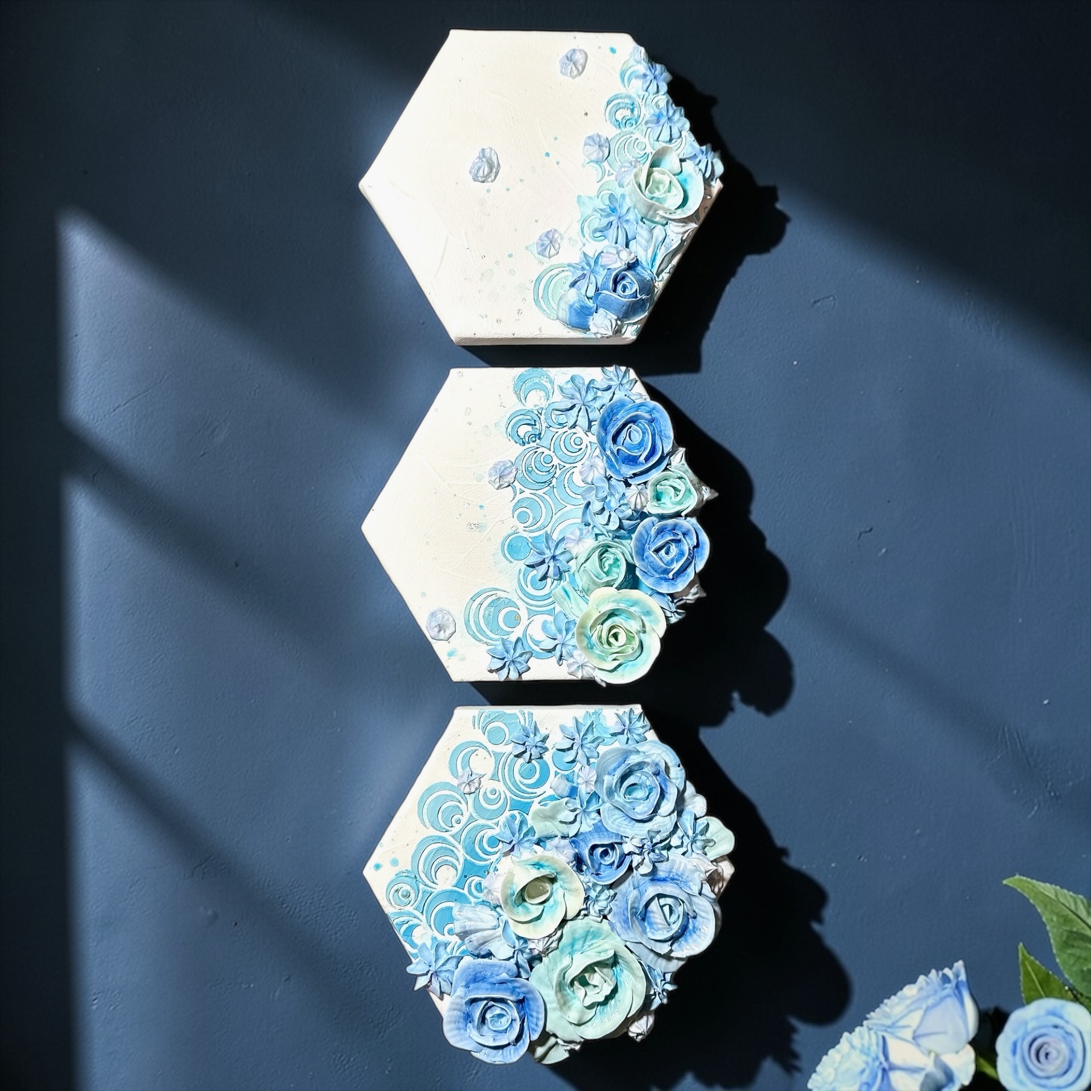 最も安定し、調和を生み出すとされる「六角形」のキャンバスを使用した3連のモリモリアートです。