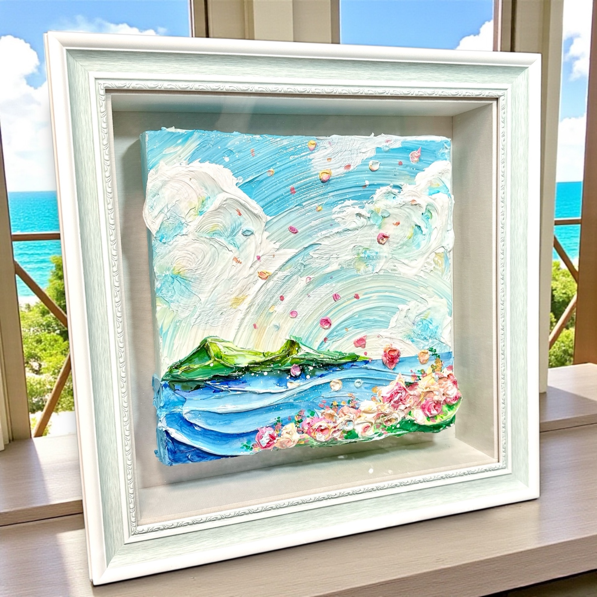 今回の作品は、あなたが思い描く「念願の場所」へと向かうエネルギーを、重なる絵の具の凹凸で表現しました。