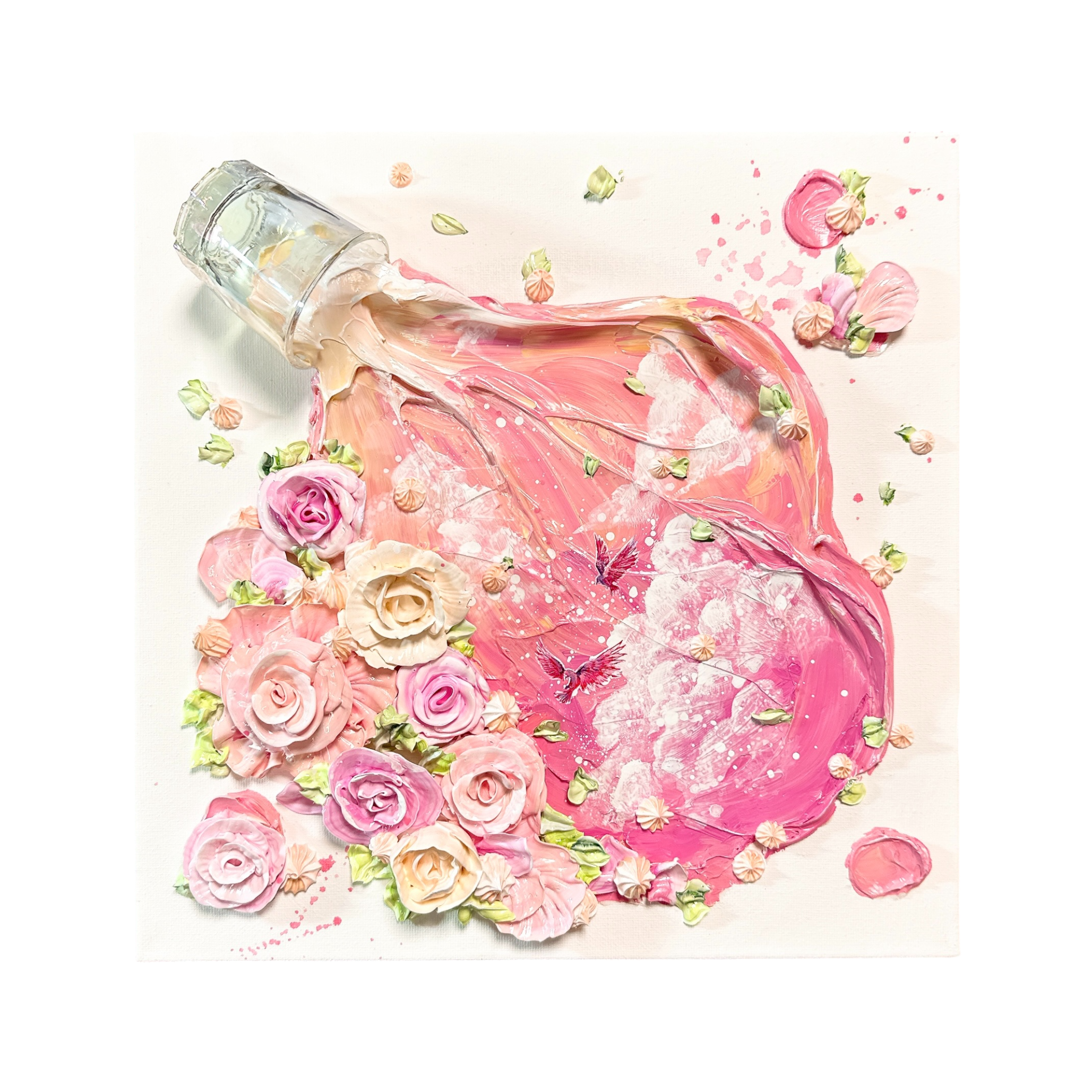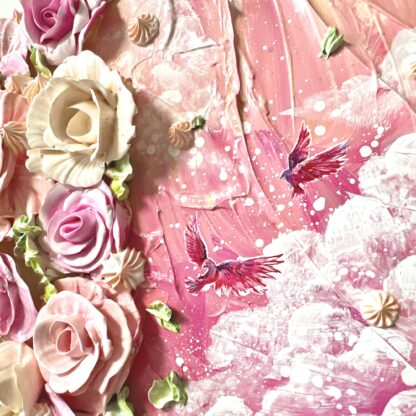 お花の匂いにつられて遊びに来た2羽はこれからどんなお話をするんだろう、そしてどこにまた飛び立っていくんだろうと想像しながら描き上げました。