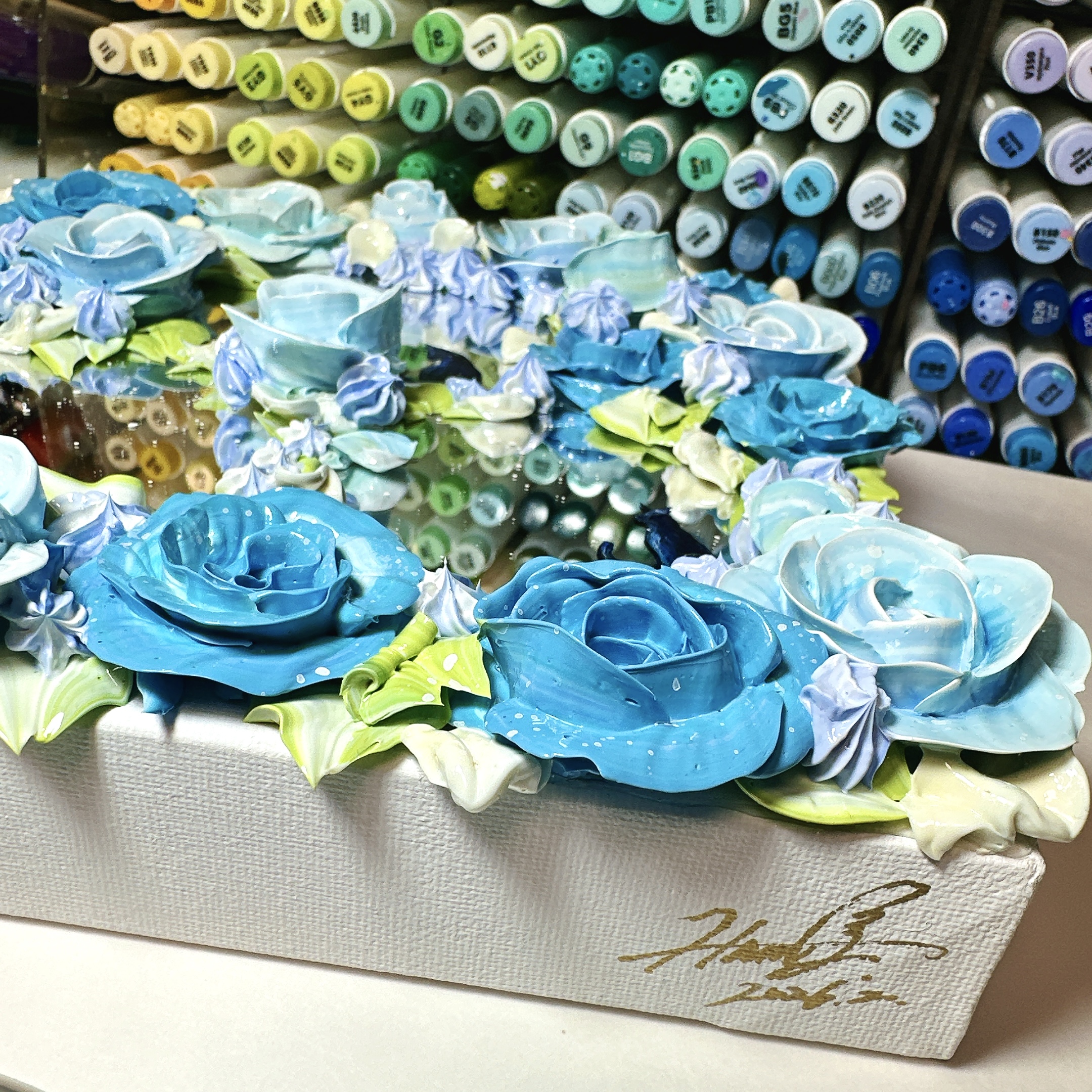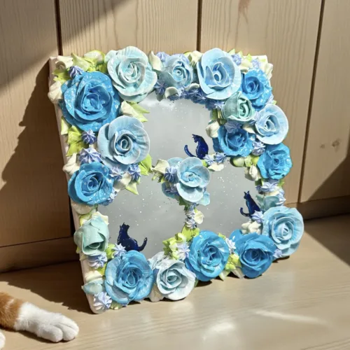 鏡花水月という言葉があるように、鏡に映る花たちを今回はモリモリアートで表現しました。