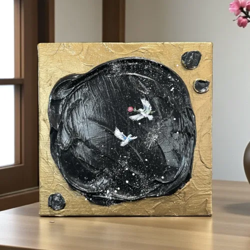 金と黒の神秘的な世界の中にお互いを照らし合わせるように飛ぶ2羽の白い鳩を描きました。