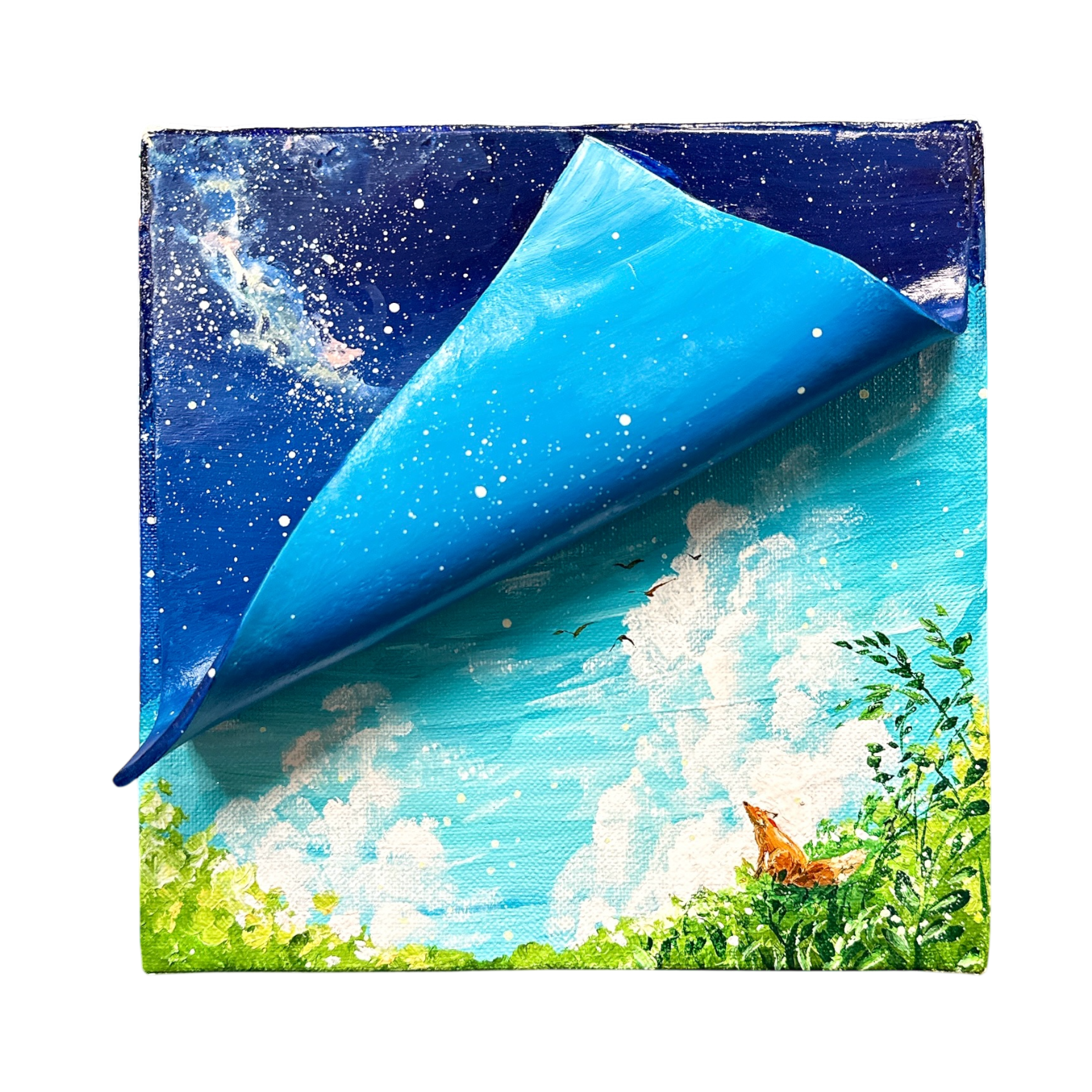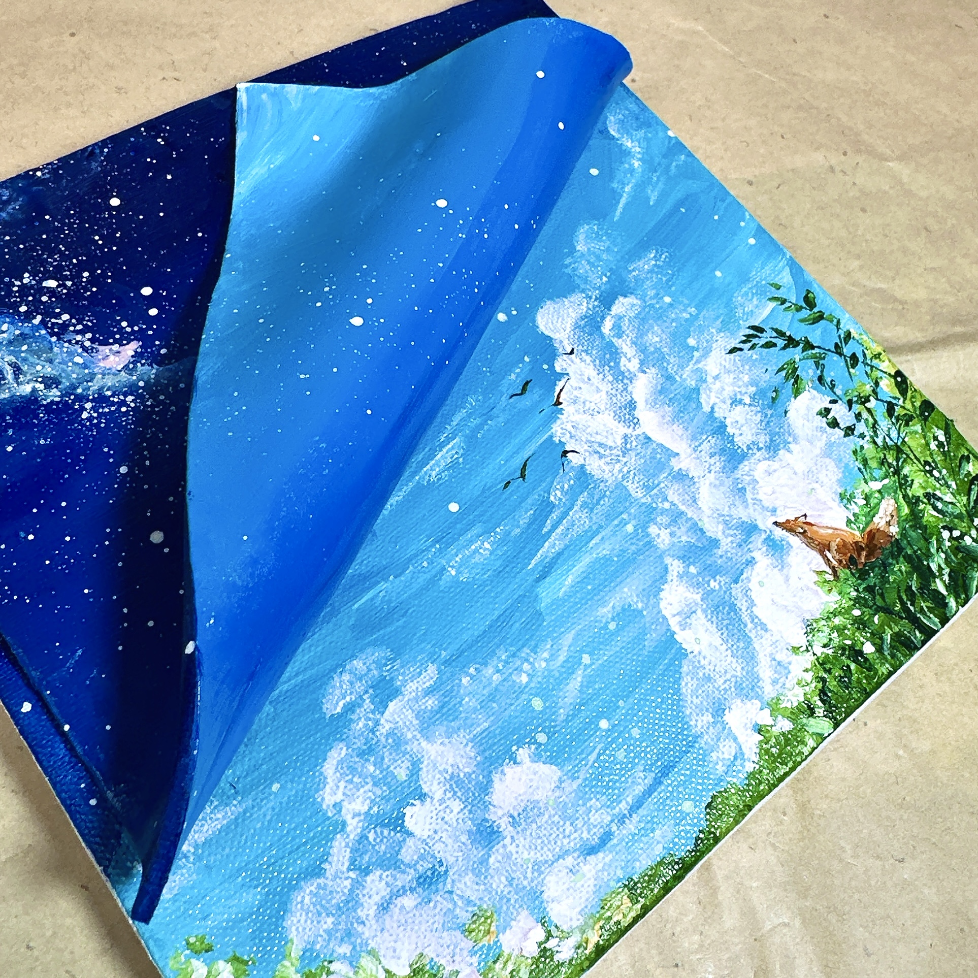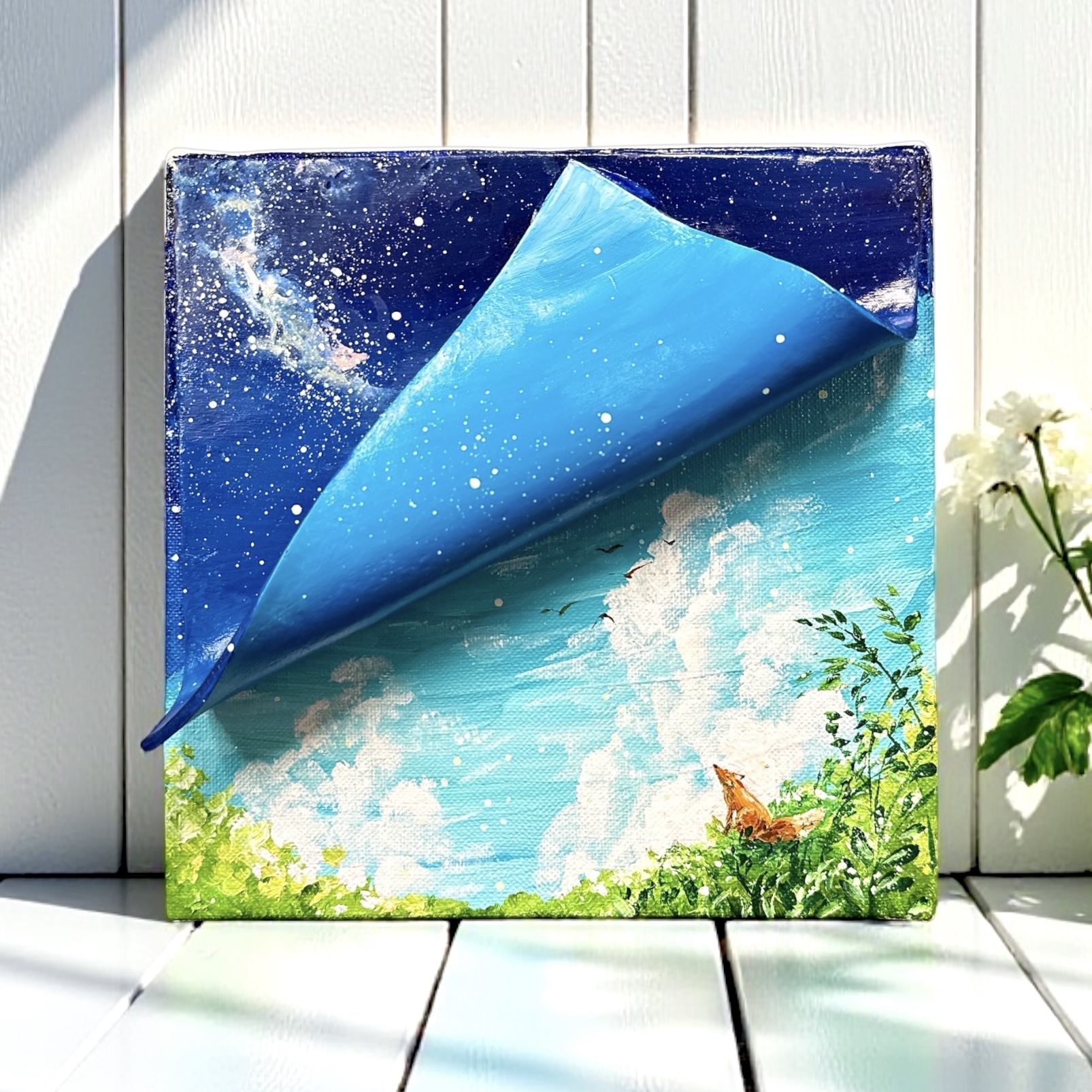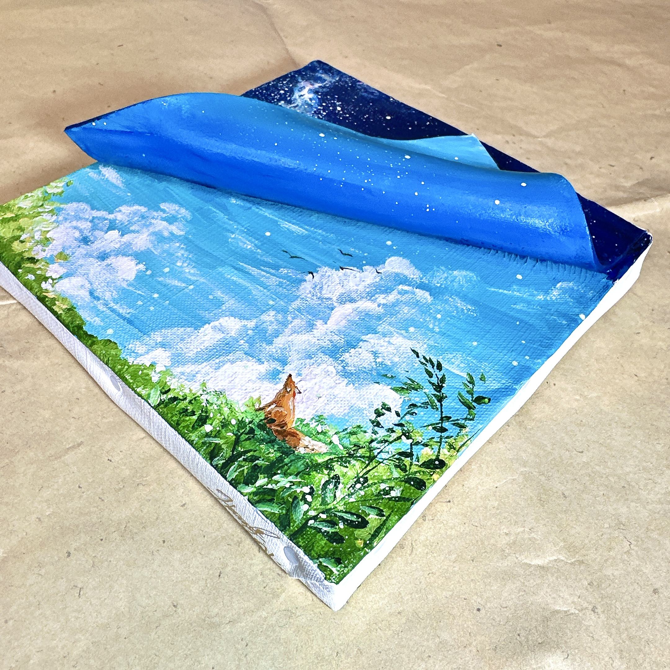 今回はそんな商売繁盛や金運にも良いとされているキツネが、夜を超えて快晴の元で遠くを見つめる姿を描きました。